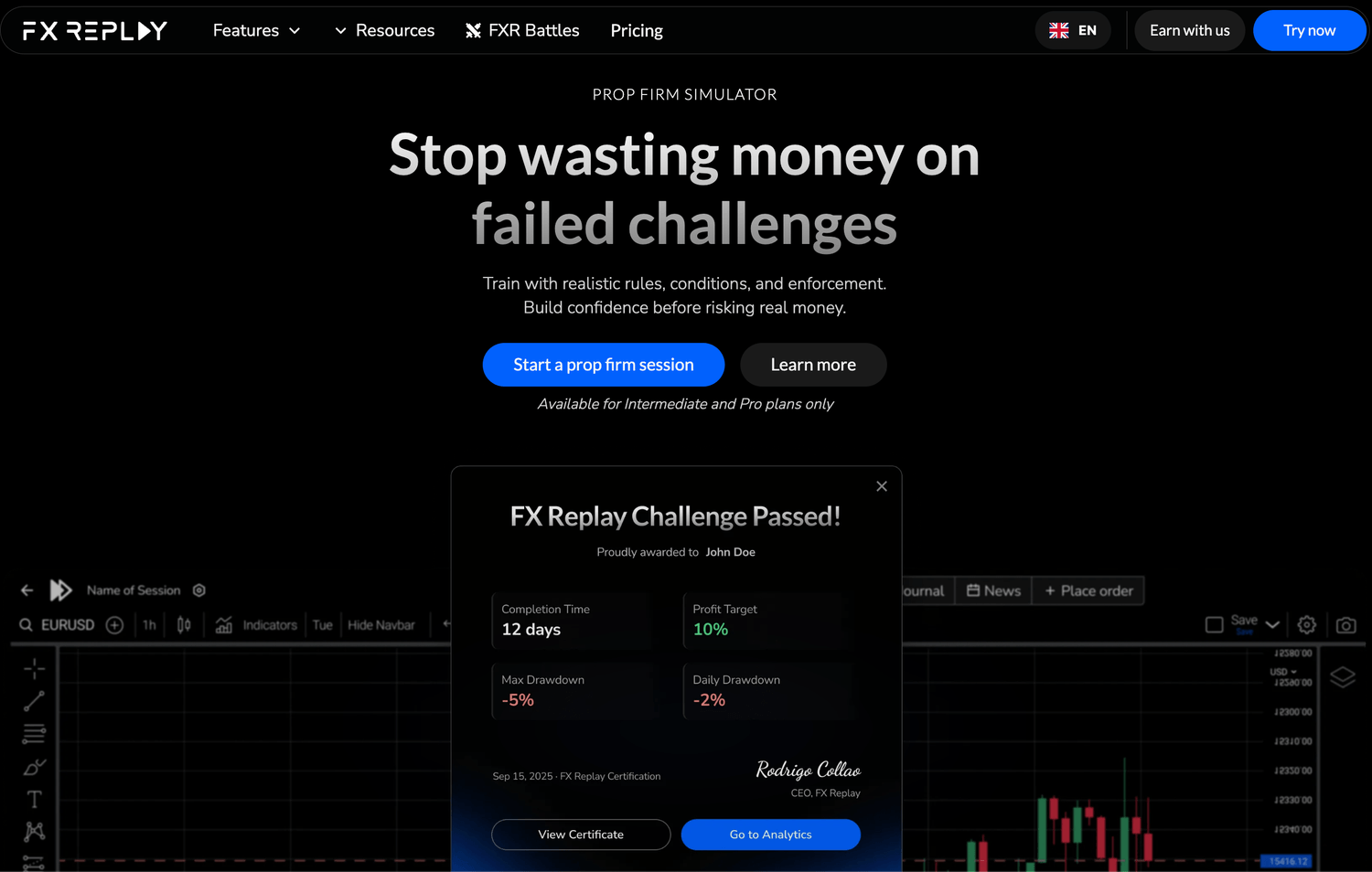 Test je strategie met de prop firm simulator van FX Replay om te zien of je de challenge kan winnen, zonder ervoor te betalen.